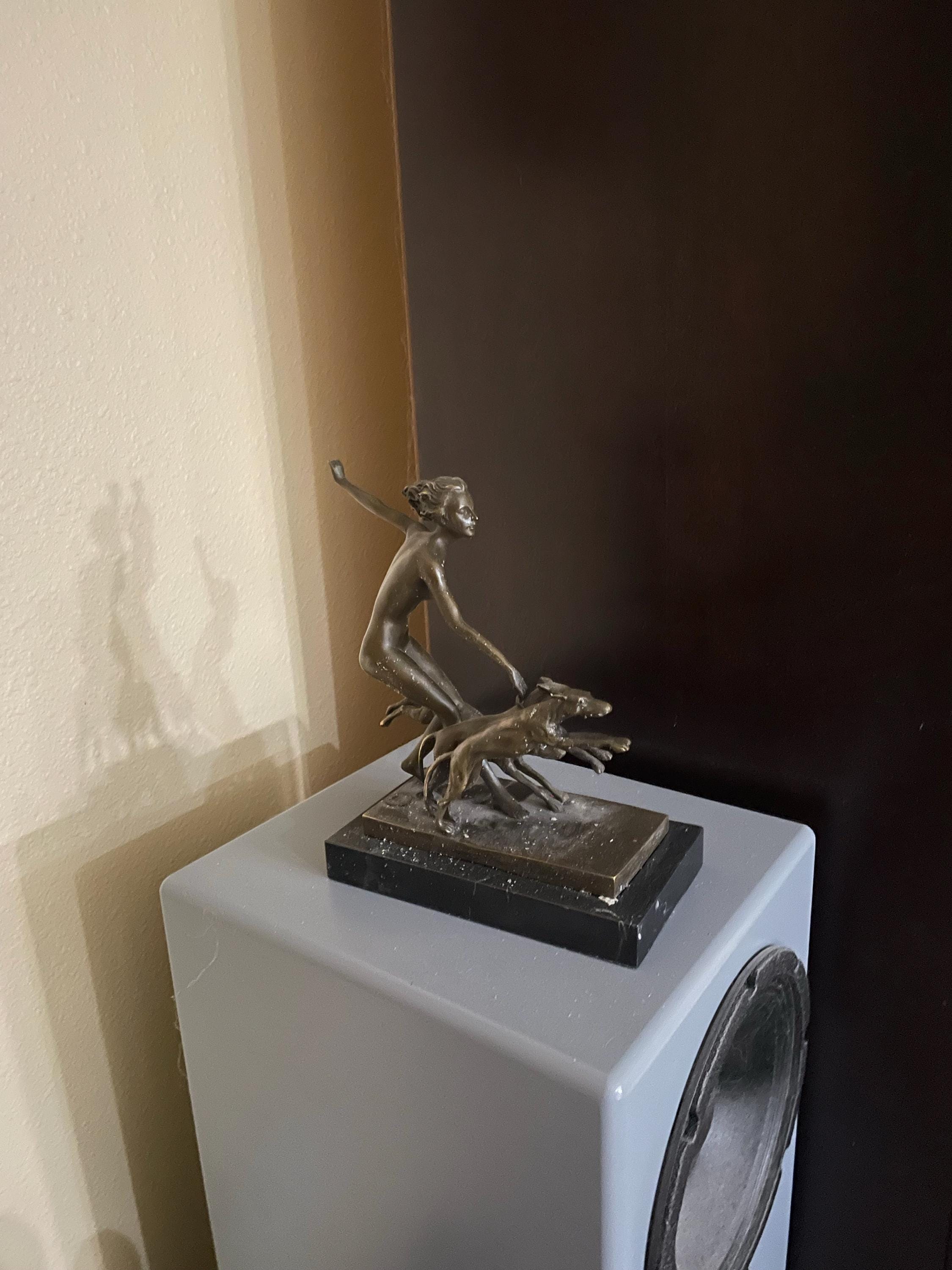 Crafted with meticulous attention to detail, the figures of Diana and the greyhound showcase the skill and artistry of the sculptor. The intricate textures of Diana's attire and the lifelike portrayal of the loyal greyhound evoke a sense of grace and power.