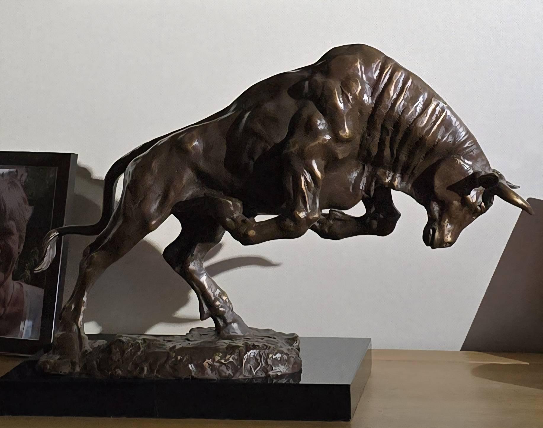 As a symbol of wealth and financial prowess, this bull sculpture pays homage to the iconic charging bull statues found in financial districts, notably the famous Charging Bull in New York. The bronze finish adds a timeless touch, making it an enduring piece of art that complements various decor styles.