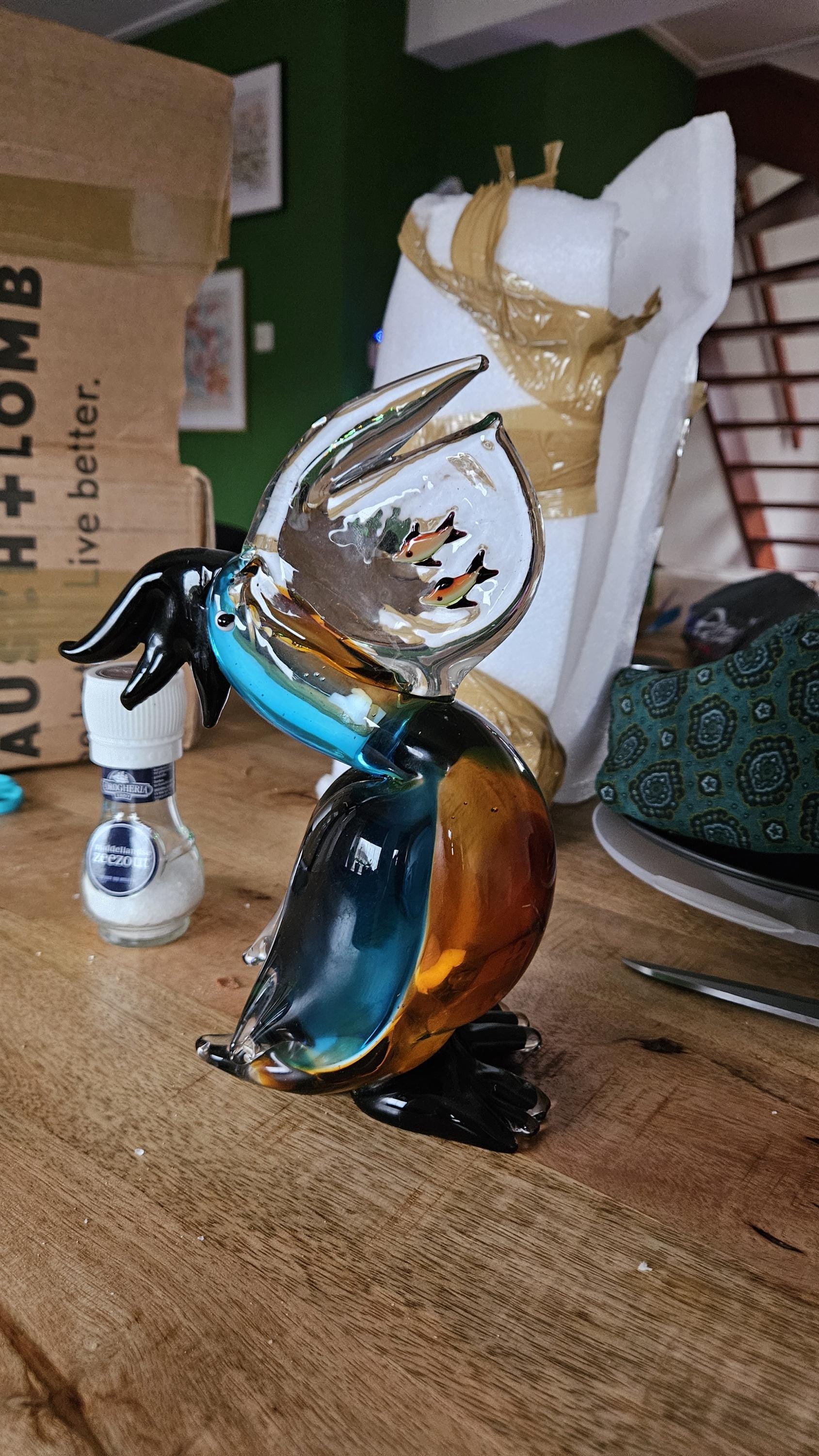 Whimsical Murano glass figurine, this vividly colored pelican with the fish in his beak is adorable. Fair price, prompt shipping!